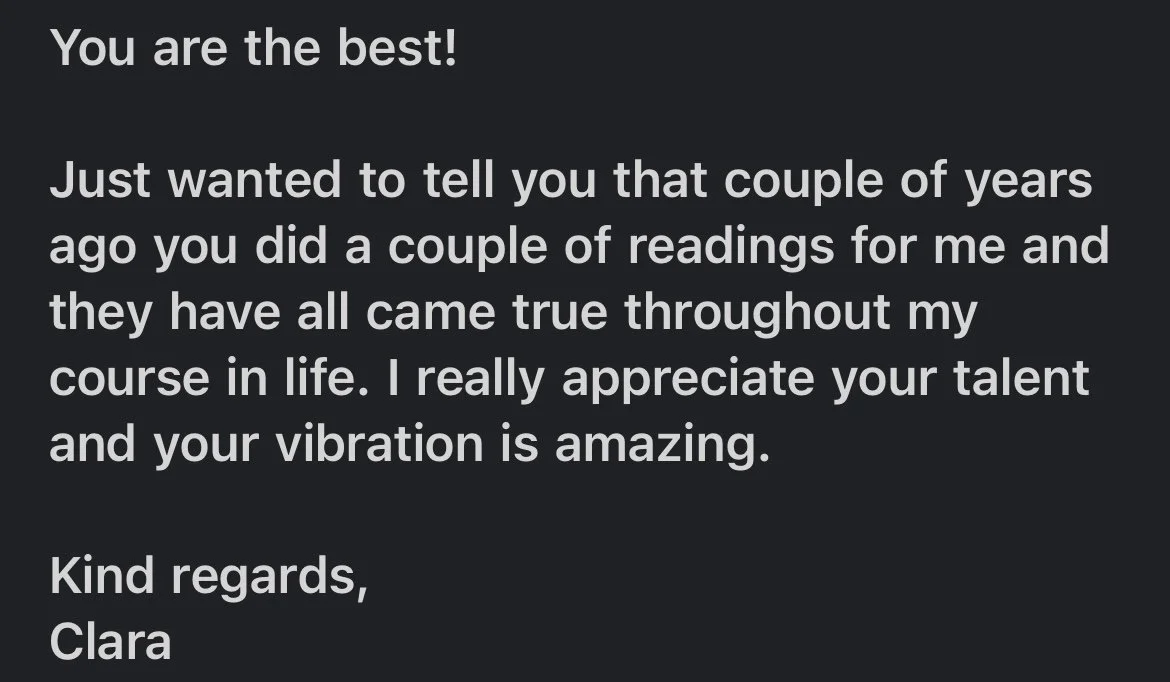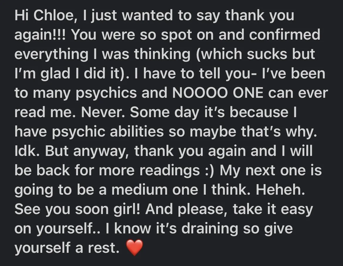 “Chloe is an amazing reader. I’ve known her for almost 2 years and her readings are always spot on. I have regular readings with her and she amazes me every time. I definitely recommend booking a private reading with her. You won’t be disappointed!”
